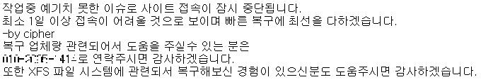 음… 오전엔 된거 같은데, 결혼식장 갔다와서 접속해보니… 공지하나만… 덩그라니… 싸이퍼 대장님 힘내세요~