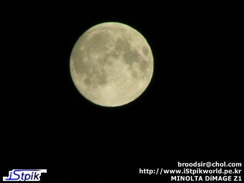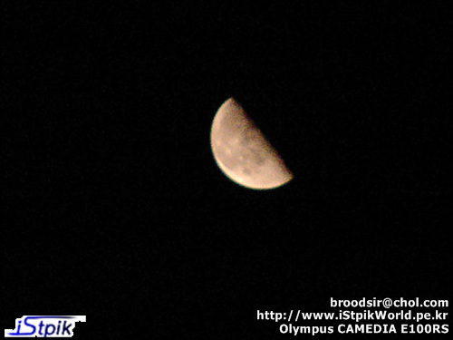 100rs에 익숙해 지지 않은탓인지 생각보다는 만족스럽지 않군요. 셔터스피드를 좀더 느리게 할걸… 게다가 ISO를 Auto로 해 놓은걸 잊어서 400으로 찍힌듯, 노이즈는 지글지글… 뭐, 달은 딱 반달모양이네요