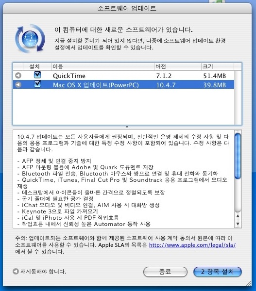 뭐 MacOSX 10.4.7이야 나온지 얼마안되었지만… 그…. 랜카드가 말썽인탓에 ADSL라인을 아이북에 직접 물려서 업데이트 시켰습니다. 사실… 뭐가 바뀐건지 모르겠습니다. 그냥 권장 업데이트라니까 했을뿐…