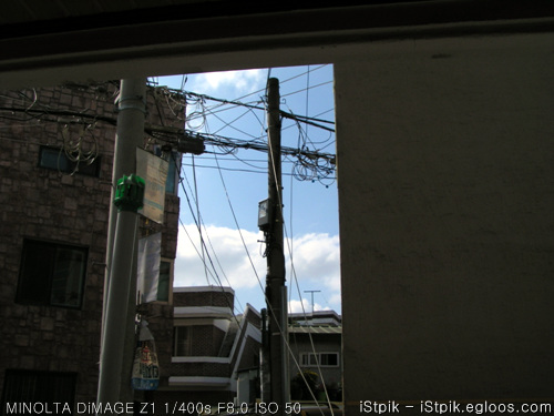수 많은 원룸이 밀집한곳 답게, 전기줄이 거의 엉키듯이 자리를 지키고 있는 모습입니다요… 저는 그나마 햇 빛이 잘 들어오는 방향쪽으로 방을 잡아서 하늘을 볼 수 있는걸 다행이라고 여기는 중입지요… 노출이 좀 적었는지 어둡지만, 지금 해가 안떠서 어두운걸 반영하면 뭐 현실적이라고…(퍽!)