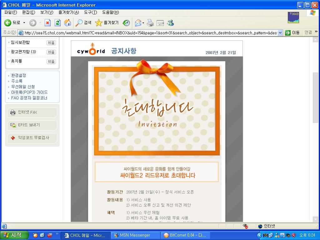나도 이제 싸이월드란것을 시작해 볼까… 2007년 2월 21일 by iStpik 팩토리로부터 초대장이 날아왔습니다. 아무래도 제가 욕심이 과한듯 ㅡㅡ; 지금 이글루스쪽 계정도 내팽개쳐놓은 상황에 이것마져 신청해 놓다니… http://www.cyworld.com/iStpik