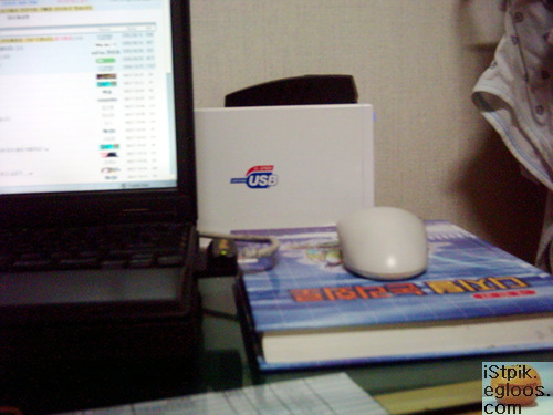 이런모습으로 사용중입니다. USB1.1이 느리기는 하지만, 어쩔수 없지요. PCMCIA USB 2.0카드를 사기는 좀 그렇고 말입니다. 흰색이라 깔끔해보이는군요.